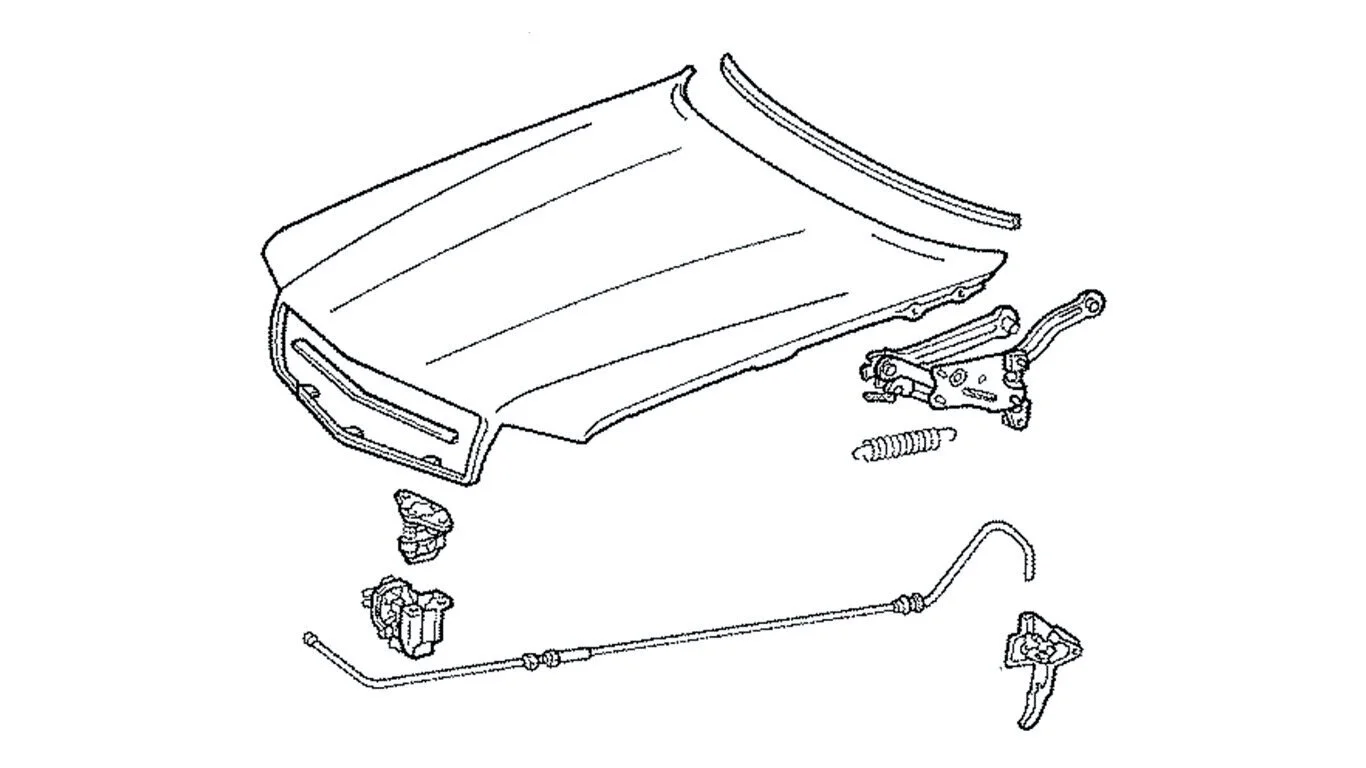 Hood - Buffer, handles, pad and latch, release cables, shocks, and straps.